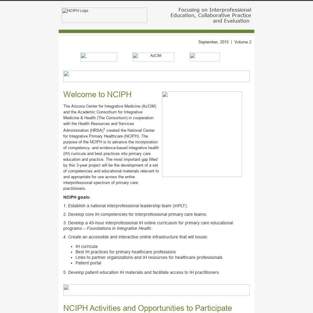 The Arizona Center for Integrative Medicine (AzCIM) and the Academic Consortium for Integrative Medicine & Health (The Consortium) in cooperation with the Health Resources and Services Administration (HRSA)1 created the National Center for Integrative Primary Healthcare (NCIPH). The purpose of the NCIPH is to advance the incorporation of competency- and evidence-based integrative health (IH) curricula and best practices into primary care education and practice. The most important gap filled by this 3-year project will be the development of a set of competencies and educational materials relevant to and appropriate for use across the entire interprofessional spectrum of primary care practitioners. NCIPH goals: 1. Establish a national interprofessional leadership team (InPLT). 2. Develop core IH competencies for interprofessional primary care teams. 3. Develop a 45-hour interprofessional IH online curriculum for primary care educational programs – Foundations in Integrative Health. 4. Create an accessible and interactive online infrastructure that will house:- IH curricula